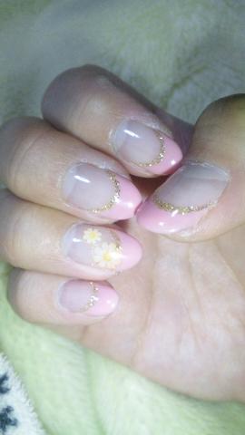 100324_0007131.jpgこれが先月やってたデザイン。前回ストーンが引っかかって次々に取れてしまうとゆう惨事に見舞われたので、3月はデコデコせずに平面デザインにしました。ベースはクリア、指先はバイオの2064でフレンチにして、境目にゴールドのラメでラインを引いてもらっいました。右手の薬指に押し花シールを入れてもらったんだけれど、本当は本物の押し花が良かったんだよね。だけど、ここにはシールタイプしか置いていないとゆうことで妥協しました。以前通っていたサロンでは、ジェルに押し花入れると変色してしまうからって言ってやってもらえなかったんだけど、このお店のお姉さんに聞いたら、淡い色のお花でなければ案外大丈夫とゆうことでした。シールとリアル押し花ではかわいさがぜんぜん違うので、いつかリベンジしたいと思います。